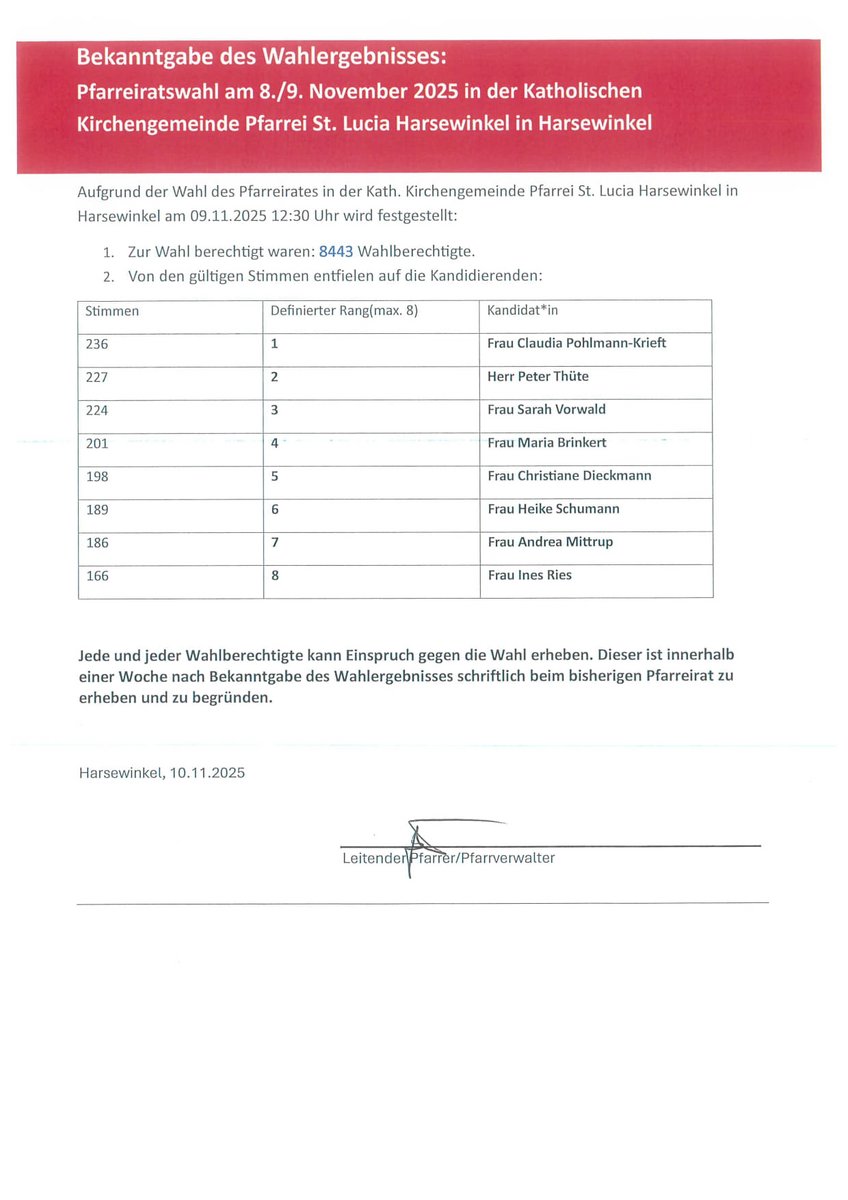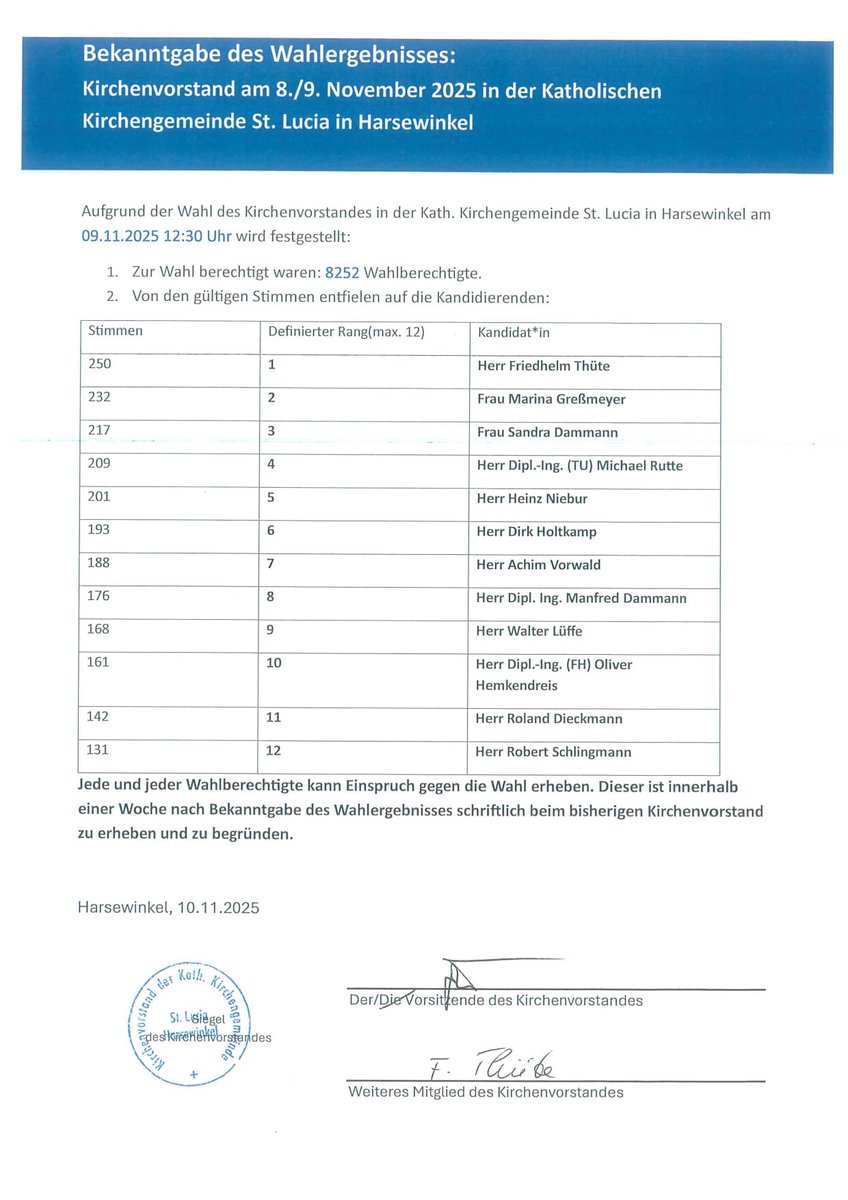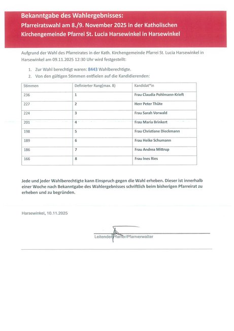 Bekanntgabe des Wahlergebnisses in der Katholischen Kirchengemeinde St. Lucia Harsewinkel