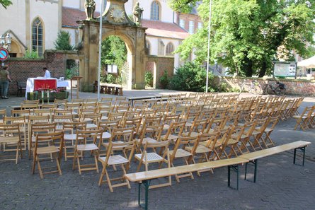 Die Freiluftgottesdienste beginnen jeweils um 10.45 Uhr auf dem Platz zwischen Friedhofsmauer/Torbogen und Klosterladen.