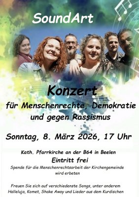 Die Kath. Kirchengemeinde in Beelen bietet am Sonntag, den 8. März um 17.00 Uhr ein Konzert mit der Gruppe SoundArt in der Pfarrkirche in Beelen an.