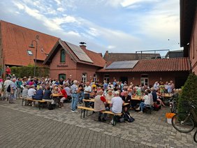Die Greffener Gruppe ging den Sassenbergern entgegen und traf dann auf dem Kirchplatz in Greffen mit den Harsewinkelern und Beelenern zusammen, die das letzte Wegstück ebenfalls gemeinsam zurückgelegt hatten. Alle waren dankbar für eine kühle Erfrischung oder eine stärkende Tasse Kaffee.